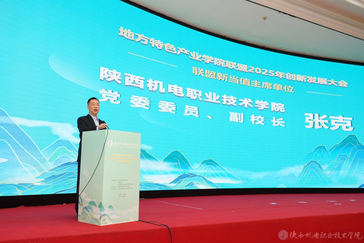 联盟新当值主席单位——陕西机电职业技术学院党委委员、副校长张克作表态发言。他首先对联盟各成员单位的信任与支持表示衷心感谢,并郑重承诺,作为新任轮值主席单位,学校将恪尽职守,紧密围绕联盟宗旨,从强化协同联动、深化产教融合、推动资源共享三个方面着力,积极搭建高效务实的合作平台,携手各成员单位共同探索地方特色产业人才培养的新模式、新路径,为服务区域经济高质量发展贡献联盟的智慧和力量。