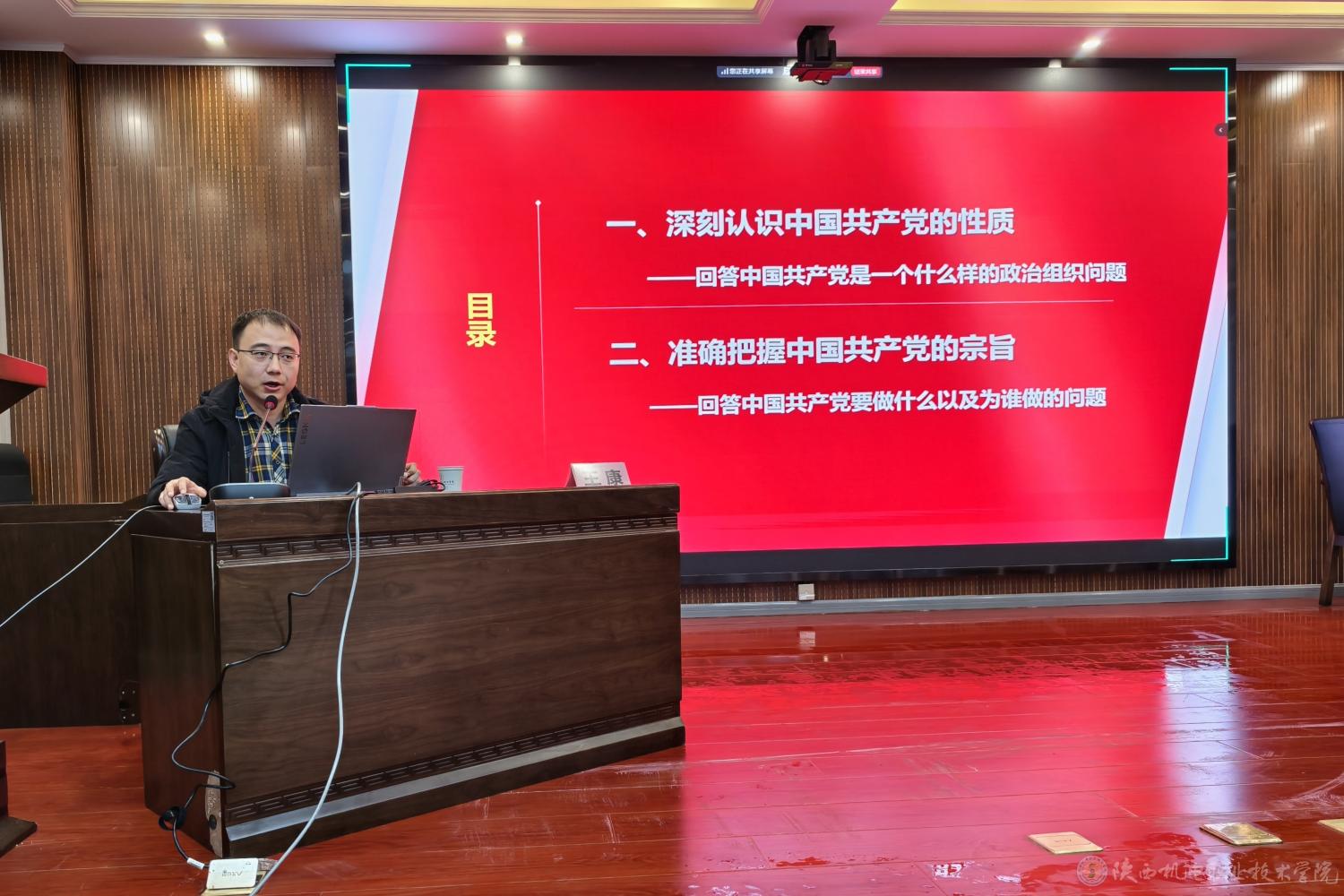 马克思主义学院负责人王康作题为《中国共产党的性质和宗旨》的专题报告。